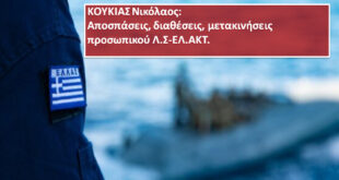 ΚΟΥΚΙΑΣ Νικόλαος: Αποσπάσεις, διαθέσεις, μετακινήσεις προσωπικού Λ.Σ-ΕΛ.ΑΚΤ.
