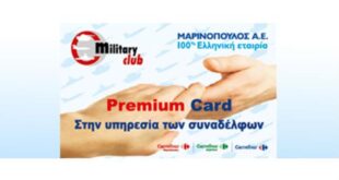 Τι είναι η Premium Card Η Premium Card εκδίδεται από το Military Club σε συνεργασία με την εταιρεία ΜΑΡΙΝΟΠΟΥΛΟΣ Α.Ε. Με την απόκτηση της κάρτας έχετε προνομιακή έκπτωση 5% στις αγορές που πραγματοποιείτε στα καταστήματα Carrefour Μαρινόπουλος, Carrefour Express και Carrefour. Πώς χρησιμοποιείται η Premium Card Η έκπτωση αφαιρείται αυτόματα από την αξία των αγορών σας επιδεικνύοντάς την στο ταμείο. Πέραν της …