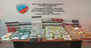 Ένας 37χρονος αλλοδαπός και ένας 54χρονος ημεδαπός συνελήφθησαν, απογευματινές ώρες χθες, από στελέχη του Κεντρικού Λιμεναρχείου Ηρακλείου, για κατοχή και διακίνηση χιλίων επτακοσίων εβδομήντα οχτώ (1.778) συνολικά λαθραίων πακέτων τσιγάρων, τριακοσίων είκοσι οχτώ (328) συνολικά λαθραίων συσκευασιών καπνού, καθώς και επτακοσίων εννέα γραμμαρίων (709gr) μικτού βάρους συσκευασμένου καπνού. Συγκεκριμένα, σε έλεγχο που πραγματοποιήθηκε από στελέχη του Γραφείου Ασφαλείας της Λιμενικής …