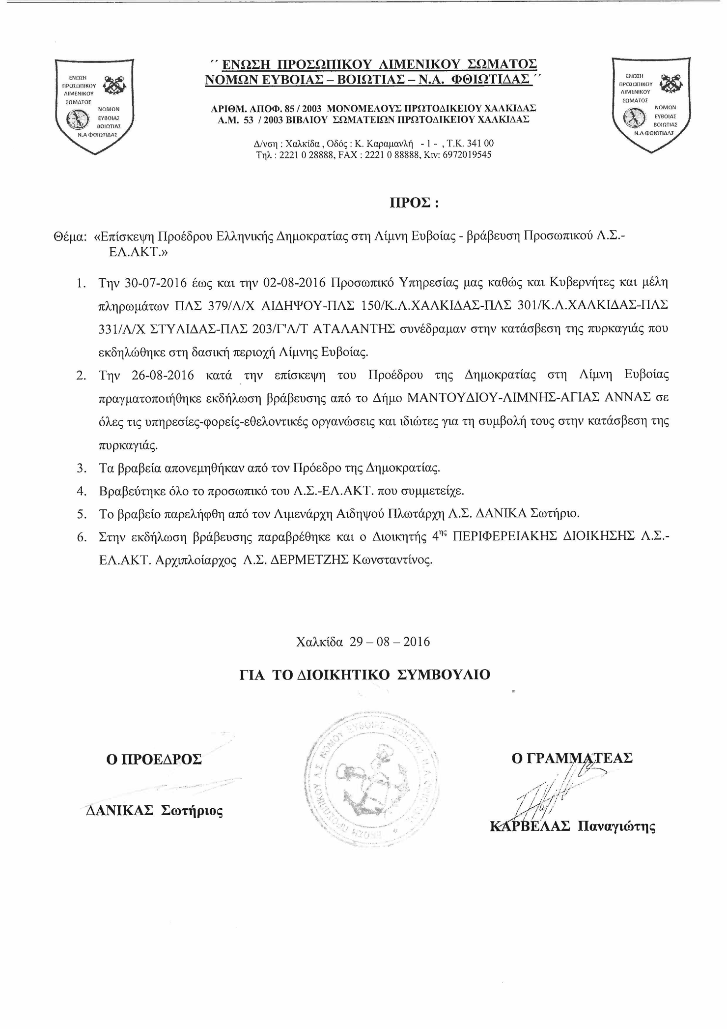 ΤΙΜΗΤΙΚΕΣ ΒΡΑΒΕΥΣΕΙΣ ΠΡΟΣΩΠΙΚΟΥ ΑΠΟ ΤΟΝ ΠΡΟΕΔΡΟ ΤΗΣ ΔΗΜΟΚΡΑΤΙΑΣ