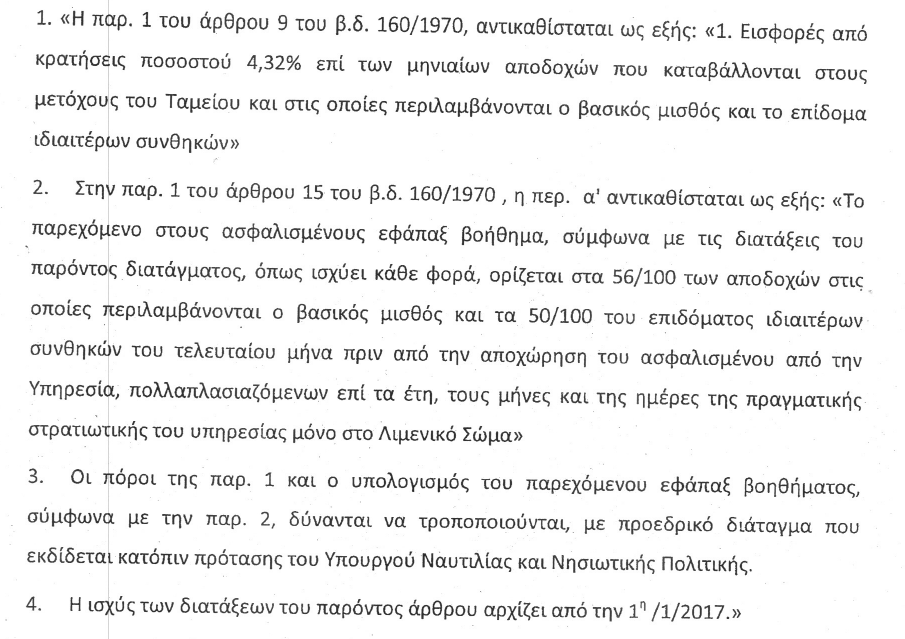 Με την προτεινόμενη ρύθμιση καθορίζονται εισφορές υπέρ του ταμείου και το ποσοστό των αποδοχών για το καθορισμό του εφάπαξ βοηθήματος στους ασφαλισμένους.