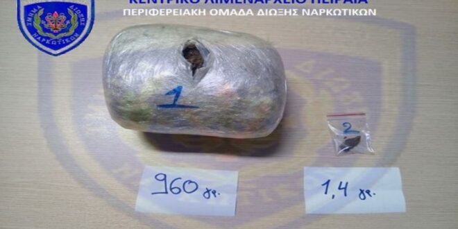 Συγκεκριμένα, ο ανωτέρω κατά τη διάρκεια ελέγχου που πραγματοποιήθηκε από στελέχη Λ.Σ.-ΕΛ.ΑΚΤ. με τη συνδρομή αστυνομικού σκύλου ανίχνευσης ναρκωτικών ουσιών Λ.Σ.-ΕΛ.ΑΚΤ. εντός Ε/Γ-Ο/Γ πλοίου στο λιμένα Πειραιά, διαπιστώθηκε ότι μετέφερε εντός της χειραποσκευής του μία (01) πλαστική συσκευασία περιέχουσα ακατέργαστη κάνναβη μικτού βάρους εννιακοσίων εξήντα γραμμαρίων (960gr), καθώς και μία (01) μεταλλική ταμπακιέρα που περιείχε (01) πλαστική συσκευασία με ακατέργαστη κάνναβη μικτού βάρους ενός γραμμαρίου και τεσσάρων δεκάτων του γραμμαρίου (1,4gr).