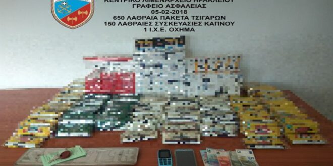 Συγκεκριμένα, σε έλεγχο που διενεργήθηκε, κατόπιν αξιοποίησης πληροφοριών για μεταφορά λαθραίων καπνικών προϊόντων μέσω Ε/Γ-Ο/Γ πλοίων και στη συνέχεια τη διάθεσή τους στο Νομό Ηρακλείου, εντοπίστηκε ο ανωτέρω επί της εθνικής οδού Ηρακλείου – Φαιστού με Ι.Χ.Ε. όχημα ιδιοκτησίας του, να μεταφέρει προς το Ηράκλειο, εξακόσια πενήντα (650) πακέτα τσιγάρων και εκατόν πενήντα (150) συσκευασίες καπνού των πενήντα γραμμαρίων έκαστη, στερούμενα τελωνειακού ελέγχου και ένσημης ταινίας ειδικού φόρου κατανάλωσης.