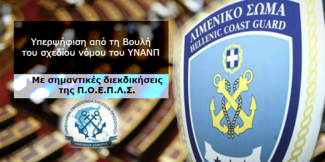 Υπερψηφίσθηκε χθες από το Ελληνικό Κοινοβούλιο το σχέδιο νόμου του Υπουργείου Ναυτιλίας & Νησιωτικής Πολιτικής «Εκσυγχρονισμός θεσμικού πλαισίου για τις θαλάσσιες ενδομεταφορές και λοιπές διατάξεις», στο οποίο περιλαμβάνονται διατάξεις, που αφορούν στα στελέχη Λ.Σ.-ΕΛ.ΑΚΤ. και αποτελούσαν διεκδικήσεις της Π.Ο.Ε.Π.Λ.Σ.
