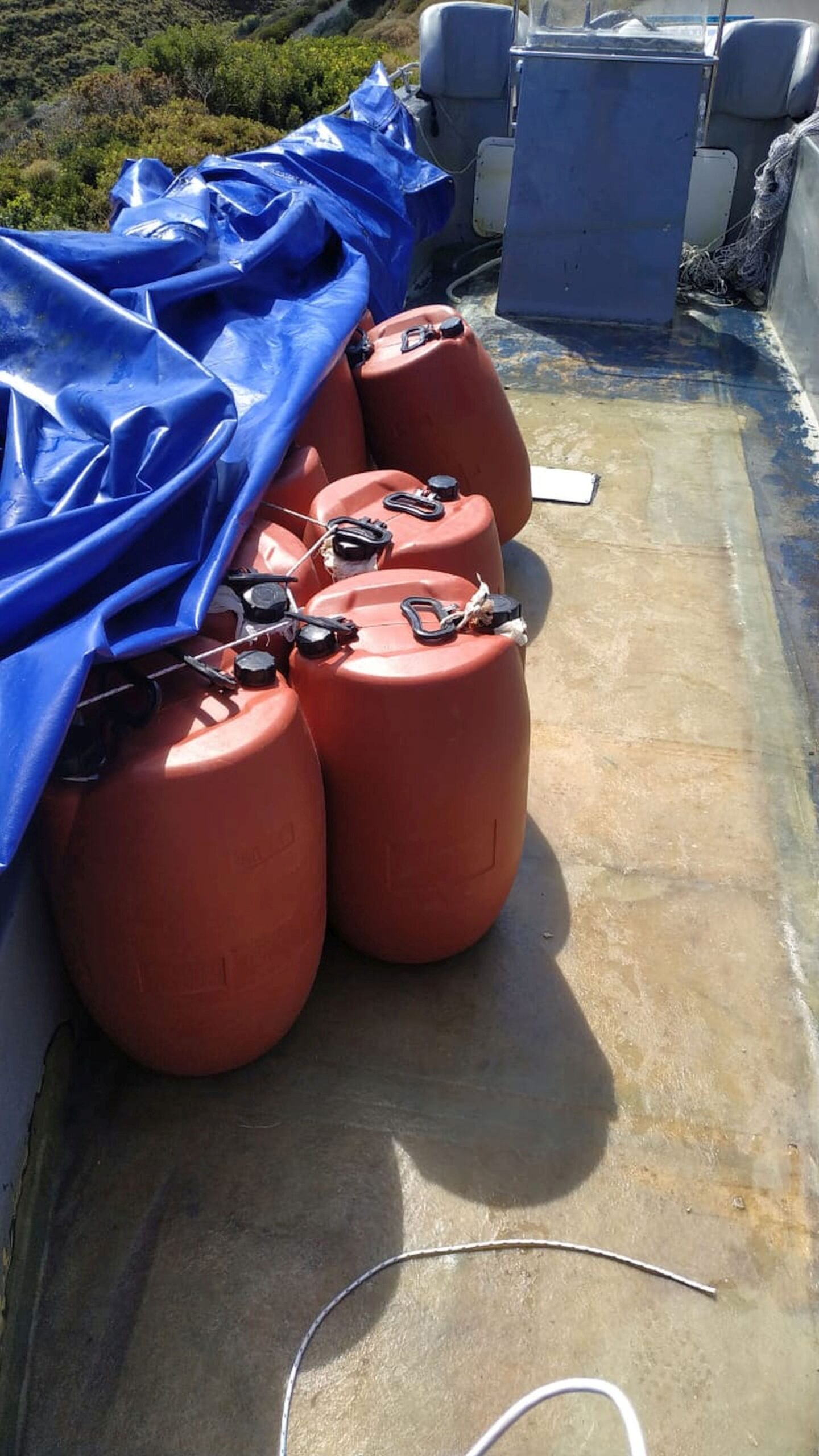 Ενημερώθηκαν άμεσα όμορες Λιμενικές Αρχές και ενεργοποιήθηκαν προσωπικό και μέσα αυτών, προς εντοπισμό του ύποπτου σκάφους το οποίο εντοπίστηκε μεσημβρινές ώρες της 08-10-2020 ημιβυθισμένο, άνευ φορτίου και επιβαινόντων πλησίον Ακρ. Ταινάρου. Εντός αυτού υπήρχαν οκτώ δοχεία με καύσιμα. Κατά την διάρκεια των ερευνών που επακολούθησαν και κατόπιν συλλογής, αξιοποίησης και ανάλυσης στοιχείων από προσωπικό της ΔΙΔΙΝΑΛ σε συνεργασία με στελέχη γραφείων ασφαλείας λιμενικών αρχών Γυθείου και Καλαμάτας, και τη συνδρομή ομάδας ΜΥΑ/ΛΣ, σε δύσβατη, βραχώδη περιοχή πλησίον Ακρ. Ταίναρου, εντός Μεσσηνιακού κόλπου, εντοπίστηκαν επιμελώς αποθηκευμένα τα κάτωθι: