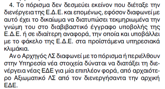 «4. Το πόρισμα δεν δεσμεύει εκείνον που διέταξε τη διενέργεια της Ε.Δ.Ε. και, εφόσον διαφωνεί με αυτό, έχει το δικαίωμα να διατυπώσει τεκμηριωμένα τη γνώμη του στο διαβιβαστικό έγγραφο υποβολής της Ε.Δ.Ε. ή σε ιδιαίτερη αναφορά, την οποία και υποβάλλει με τον φάκελο της Ε.Δ.Ε. στα προϊστάμενα υπηρεσιακά κλιμάκια.