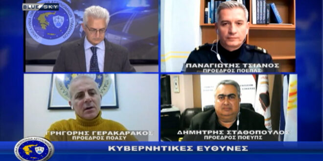 Στο πλαίσιο του κοινού μετώπου των εργαζομένων στα Σώματα Ασφαλείας και στις Ένοπλες Δυνάμεις, οι πρόεδροι των Ομοσπονδιών έκαναν έναν απολογισμό και έθεσαν τα κοινά προβλήματα, που αναμένουν την επίλυσή τους στη ζωντανή εκπομπή της Π.Ο.ΑΣ.Υ. “Αστυνομία & Κοινωνία” στον τηλεοπτικό σταθμό Blue Sky με τον Μανώλη Σταυρακάκη.
