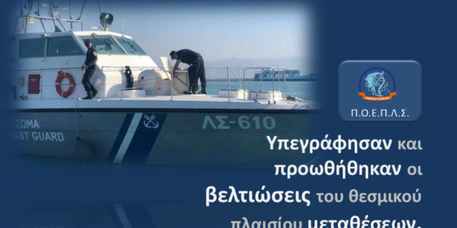 Σε συνέχεια της από 3/4/23 ανακοίνωσής μας, σας ενημερώνουμε ότι υπεγράφησαν και προωθήθηκαν από τον Υπουργό Ναυτιλίας & Νησιωτικής Πολιτικής κ. Γιάννη Πλακιωτάκη, οι τροποποιήσεις του ΠΔ 11/21 «Τοποθετήσεις, μεταθέσεις, αποσπάσεις, διαθέσεις του προσωπικού Λ.Σ.-ΕΛ.ΑΚΤ.».
