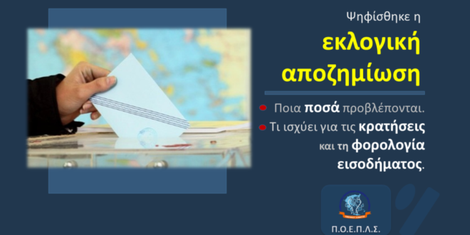 Σας ενημερώνουμε ότι στο σχέδιο νόμου του Υπουργείου Εσωτερικών με τίτλο «Ρυθμίσεις σχετικά με τους Οργανισμούς Τοπικής Αυτοδιοίκησης α’ και β’ βαθμού (…)- Λοιπές ρυθμίσεις του Υπ. Εσωτερικών και άλλες επείγουσες διατάξεις», το οποίο ψηφίσθηκε σήμερα στη Βουλή, περιλαμβάνεται τροπολογία του Υπ. Οικονομικών για την εκλογική αποζημίωση των βουλευτικών εκλογών της 21ης Μαΐου.