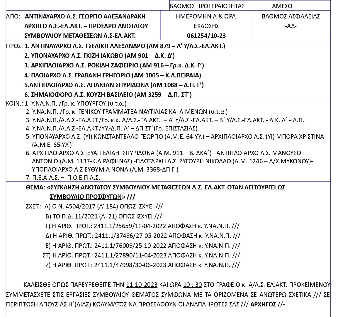 Σας ενημερώνουμε ότι την Τετάρτη 11-10-2023 και ώρα 10:30 ξεκινά τις εργασίες του το Ανώτατο Συμβούλιο Μεταθέσεων Λ.Σ.-ΕΛ.ΑΚΤ. όταν λειτουργεί ως Συμβούλιο Προσφυγών.