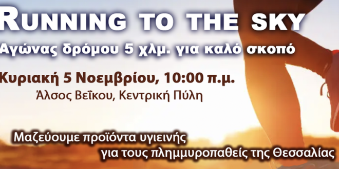 Ο αγώνας θα διεξαχθεί στο Άλσος Βεΐκου (Κεντρική Πύλη) στο Γαλάτσι, την Κυριακή 5 Νοεμβρίου στις 10:00 π.μ., με την επωνυμία «Running to the Sky» και η συμμετοχή σε αυτόν είναι δωρεάν. Αντί αντιτίμου οι συμμετέχοντες καλούνται να προσφέρουν, ότι ποσότητα μπορεί ο καθένας, από τα είδη που χρειάζονται οι πλημμυροπαθείς και όπως αυτά αναφέρονται στην ακόλουθη λίστα: