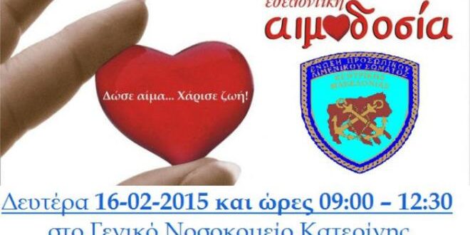 Την Δευτέρα 16-02-2015 και ώρες 09:00 – 12:30, η Ένωση μας διοργανώνει «ΕΘΕΛΟΝΤΙΚΗ ΑΙΜΟΔΟΣΙΑ» στο Γενικό Νοσοκομείο Κατερίνης.