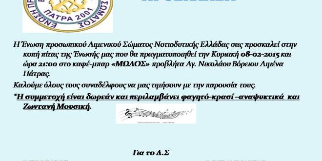 Κοπή πίτας Ένωσης Προσωπικού Λιμενικού Σώματος Νοτιοδυτικής Ελλάδος την Κυριακή 08-02-2015 και ώρα 21:00 στο καφέ – μπαρ “ΜΩΛΟΣ”