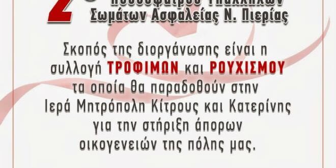 Μετά την μεγάλη ανταπόκριση και συμμετοχή του κόσμου την περσινή περίοδο, η Ένωση μας, σε συνεργασία με τις Ενώσεις Αστυνομικών Πιερίας , Πυροσβεστών Κεντρικής Μακεδονίας και Στρατιωτικών, διοργανώνει φέτος το 2ο Φιλανθρωπικό Τουρνουά Ποδοσφαίρου Υπαλλήλων Σωμάτων Ασφαλείας Ν. Πιερίας, με σκοπό την συγκέντρωση τροφίμων και ρουχισμού για την στήριξη των άπορων οικογενειών της Κατερίνης.