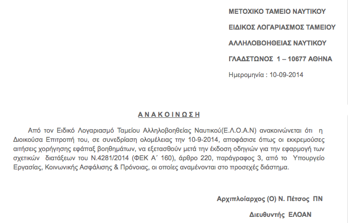 “Από τον Ειδικό Λογαριασμό Ταμείου Αλληλοβοηθείας Ναυτικού(Ε.Λ.Ο.Α.Ν) ανακοινώνεται ότι η Διοικούσα Επιτροπή του, σε συνεδρίαση ολομέλειας την 10-9-2014, αποφάσισε όπως οι εκκρεμούσες αιτήσεις χορήγησης εφάπαξ βοηθημάτων, να εξετασθούν μετά την έκδοση οδηγιών για την εφαρμογή των σχετικών διατάξεων του Ν.4281/2014 (ΦΕΚ Α΄ 160), άρθρο 220, παράγραφος 3, από το Υπουργείο Εργασίας, Κοινωνικής Ασφάλισης & Πρόνοιας, οι οποίες αναμένονται στο προσεχές διάστημα”.