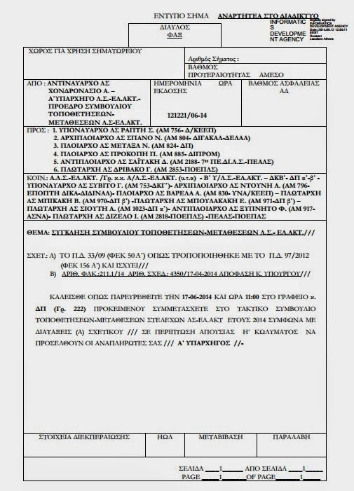 Σύμφωνα με το ανωτέρο σήμα συγκαλείται τακτικό συμβούλιο τοποθετήσεων-μεταθέσεων στις 17 Ιουνίου 2014.