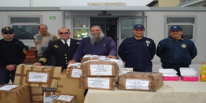 Ο πάτερ Ευστράτιος εκ μέρους της Μ.Κ.Ο., παρουσία του Κεντρικού Λιμενάρχη Μυτιλήνης Πλοιάρχου Λ.Σ. ΜΑΡΓΩΜΕΝΟΥ Εμμανουήλ καθώς και του προσωπικού του Λιμεναρχείου, παρέλαβε τα τρόφιμα τα οποία φορτώθηκαν σε φορτηγό της Μ.Κ.Ο. με προορισμό την Καλλονή Λέσβου.