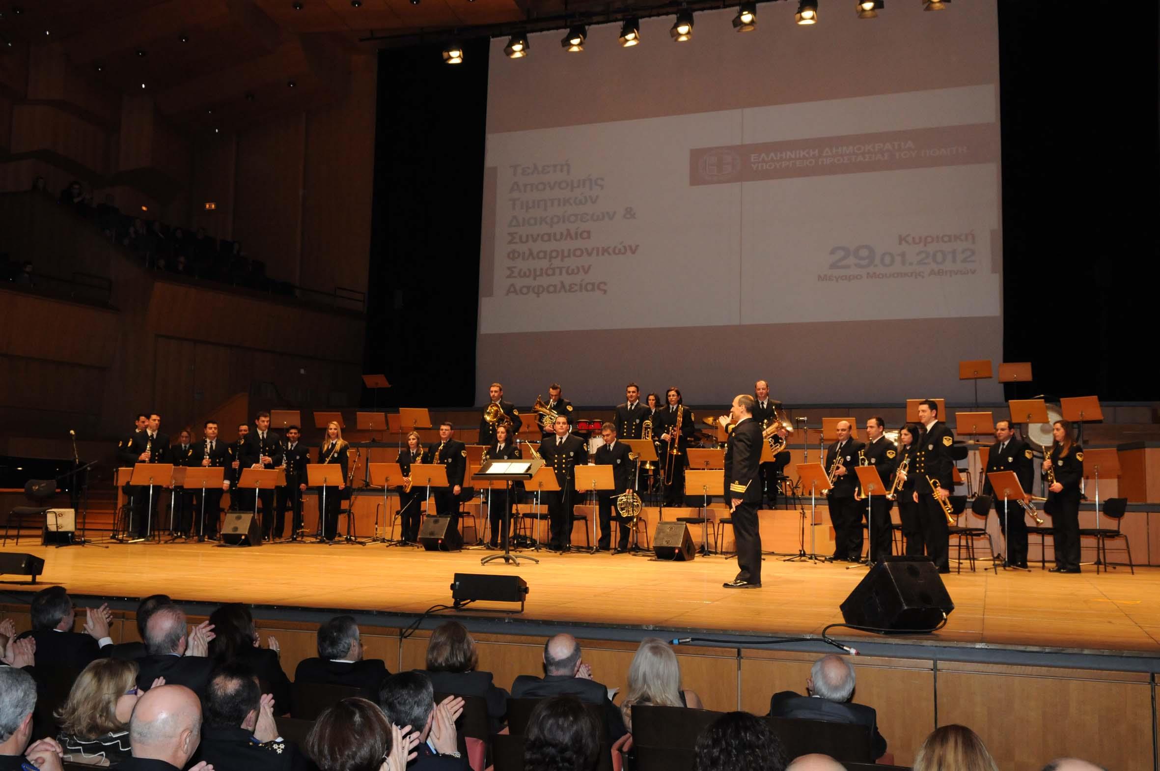 29-01-2012: Η Μουσική μας έλαβε μέρος και είχε πρωταρχικό ρόλο υπό την Γενική Διεύθυνση του νυν Διευθυντή Πλωτάρχη Λ.Σ. Ευάγγελου Κασφίκη στην διοργάνωση για την Τελετή Απονομής Τιμητικών Διακρίσεων εκ μέρους του ΥΠτΠ και Συναυλίας των Φιλαρμονικών των Σωμάτων Ασφαλείας στο Μέγαρο Μουσικής Αθηνών. Η Μουσική μας απέσπασε ευαρέσκεια από την πολιτική και στρατιωτική Ηγεσία και ευμενή σχόλια από το παριστάμενο κοινό.