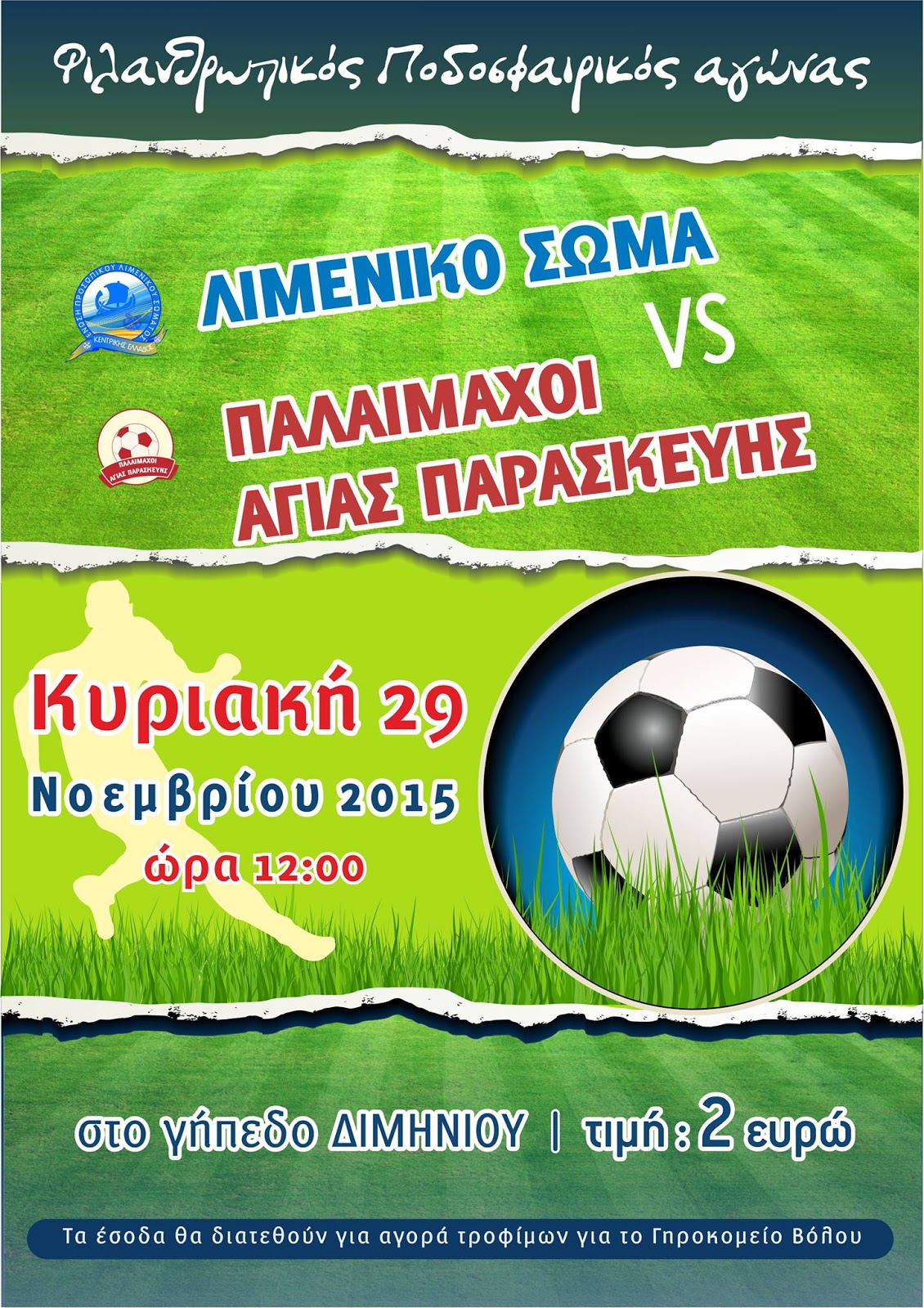 Την Κυριακή 29 Νοεμβρίου και ώρα 12:00 στο γήπεδο του Διμηνίου θα διεξαχθεί Φιλανθρωπικός ποδοσφαιρικός αγώνας μεταξύ των ομάδων του Λιμενικού Σώματος και των Παλαιμάχων της Αγίας Παρασκευής .