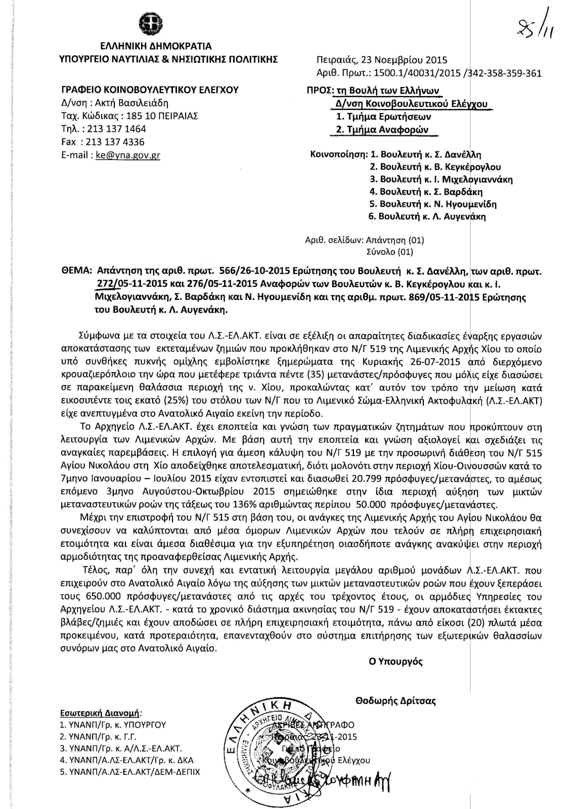 Απάντηση Υπουργού Ναυτιλίας & Νησιωτικής Πολιτικής κ. Δρίτσα Θεόδωρου σε ερωτήσεις και αναφορές Βουλευτών, σχετικά με την επιστροφή του Ν/Γ 515.
