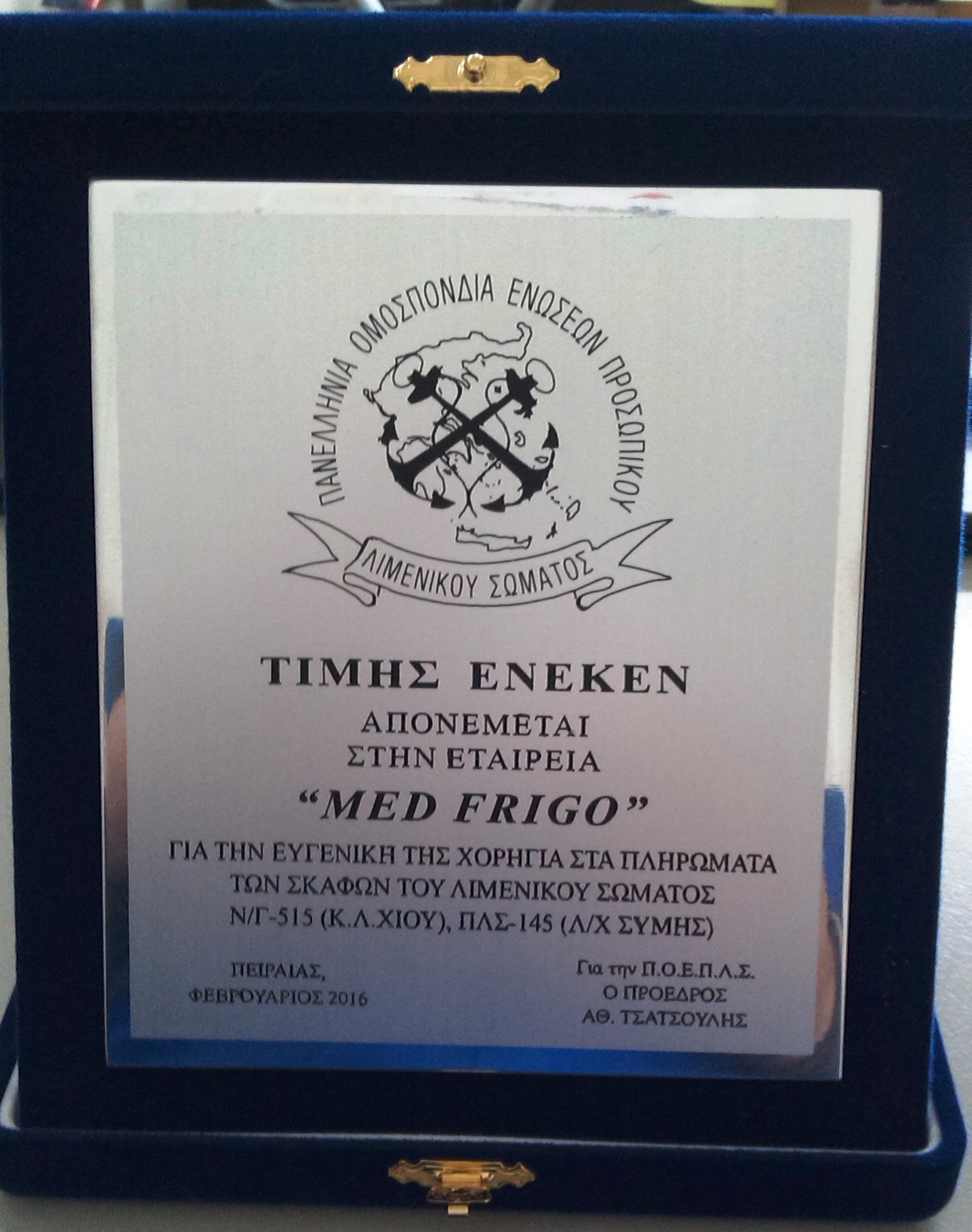 Σαν ανταπόδοση της γενναιόδωρης πράξης τους παρέδωσα στον Πρόεδρο του Δ.Σ. της εταιρείας «MED FRIGO» κύριο ΠΟΥΛΙΑ Γεώργιο και τον Διευθύνοντα Σύμβουλο κύριο ΜΠΡΑΚΑΤΣΕΛΟ Σωτήριο μια τιμητική πλακέτα διότι η άμεση ανταπόκριση τους στα αιτήματα μου είναι συγκινητική και τους ευχαριστώ θερμά. Στις δύσκολες στιγμές που βρίσκεται η πατρίδα μας, η δωρεά της εν λόγω εταιρείας σίγουρα αποτελεί δείγμα γενναιόδωρου υψηλού φρονήματος και κατανόησης της κοινωνικής ευθύνης για τους δυνάμενους να προσφέρουν.