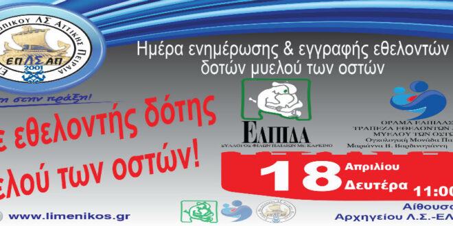 Η Ένωση Προσωπικού Λ.Σ. Αττικής-Πειραιά & Νήσων, θέλοντας για άλλη μια φορά να αναδείξει το ρόλο των στελεχών του Λιμενικού Σώματος – Ελληνικής Ακτοφυλακής και την προσφορά τους στο συνάνθρωπο, διοργανώνει ενημερωτική ομιλία από εκπροσώπους του Συλλόγου «Όραμα Ελπίδας», σχετικά με τη μεταμόσχευση μυελού των οστών και για το πολύτιμο δώρο της προσφοράς αιμοποιητικών κυττάρων/μυελού των οστών.